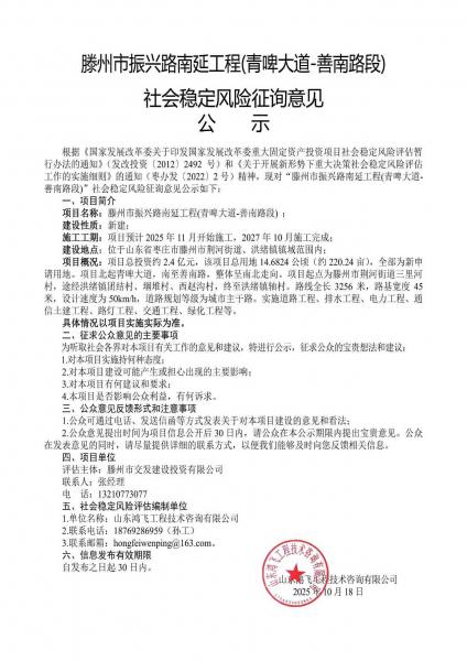 滕州市振興路南延工程(青啤大道-善南路段)社會穩(wěn)定風險征詢意見公示