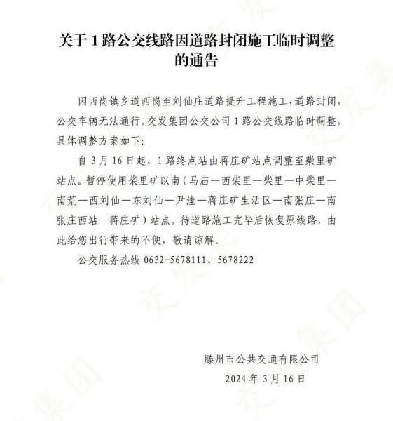 關(guān)于1路公交線路因道路封閉施工臨時調(diào)整的通告