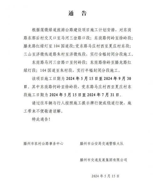 關于東崗路、滕龍路、黨東路部分路段封閉施工的通告
