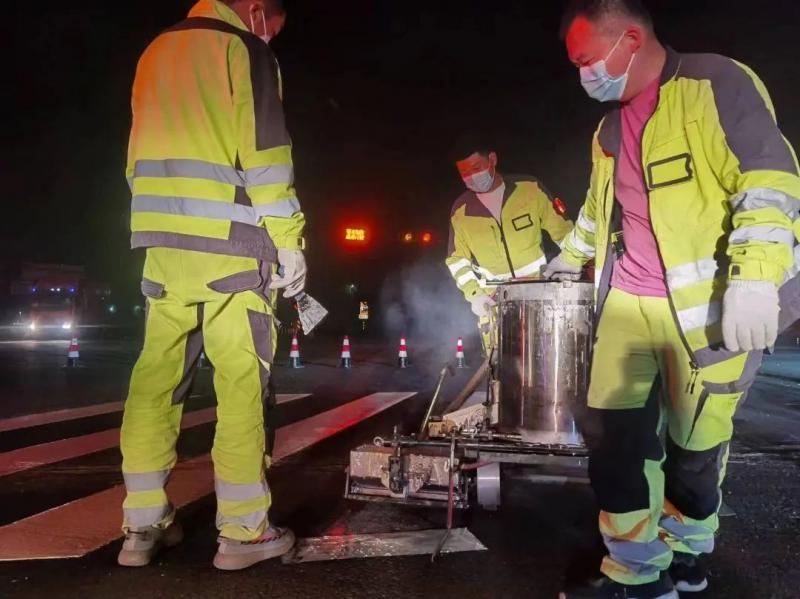 為確保白天道路交通秩序,公司施工隊(duì)伍將標(biāo)線施工安排在夜間進(jìn)行。在交通晚高峰過后,路上車流相對(duì)減少的情況下,施工人員便開始忙碌起來(lái),設(shè)置好施工標(biāo)志和警示標(biāo)志,清除施工區(qū)域的障礙物,按照預(yù)定的劃線方案,使用專業(yè)的道路劃線機(jī)械和人工輔助進(jìn)行施工,經(jīng)過連日持續(xù)夜間奮戰(zhàn),高效完成了施工任務(wù)。