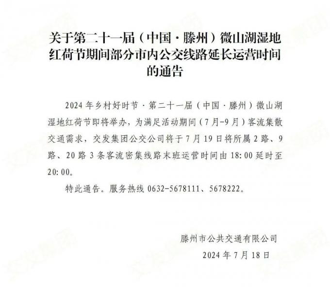 關(guān)于第二十一屆(中國·滕州)微山湖濕地紅荷節(jié)期間部分市內(nèi)公交線路延長運營時間的通告