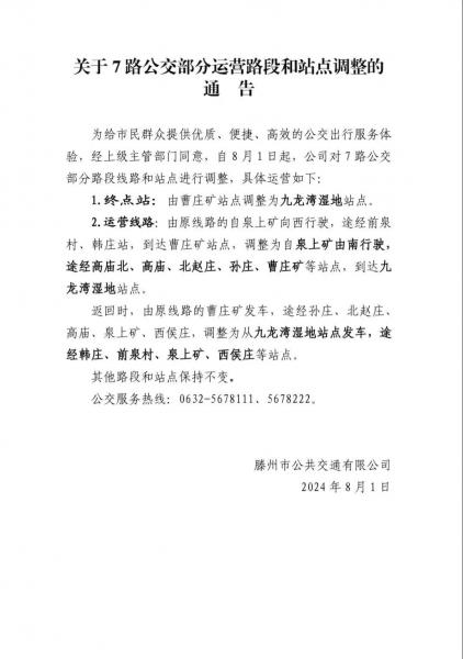 關(guān)于7路公交部分運(yùn)營路段和站點調(diào)整的通告